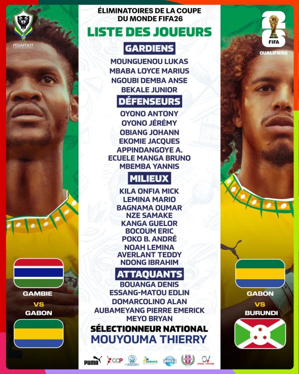 Le sélectionneur national du Gabon, Thierry Mouyouma, a publié ce vendredi depuis l’hôtel Nomad la liste des joueurs retenus pour les 9ᵉ et 10ᵉ journées des éliminatoires de la Coupe du monde 2026. Vingt-six Panthères ont été convoquées : 4 gardiens de but, 8 défenseurs, 8 milieux de terrain et 6 attaquants.