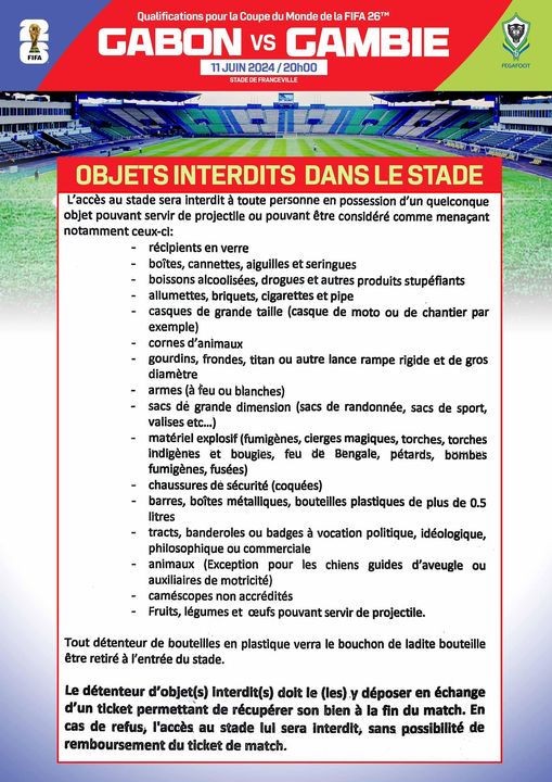 Le match très attendu entre le Gabon et la Gambie, prévu ce mardi 11 juin 2024 à 20h00 à Franceville, suscite une grande excitation parmi les supporters. Cependant, la Fédération Gabonaise de Football (FEGAFOOT) a publié ce dimanche une liste d’objets interdits pour garantir la sécurité et le bon déroulement de l’événement.