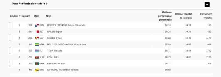 Cette série promet d’être un véritable test pour Hoye Yenda Moukoula, qui devra puiser dans toutes ses ressources pour rivaliser avec des athlètes aux classements et performances souvent supérieurs. Cependant, la dynamique d’une course peut toujours réserver des surprises, et le sprinteur gabonais pourrait bien saisir l’occasion pour se distinguer et améliorer son record personnel. La course s’annonce palpitante et pleine de suspense pour les amateurs d’athlétisme.