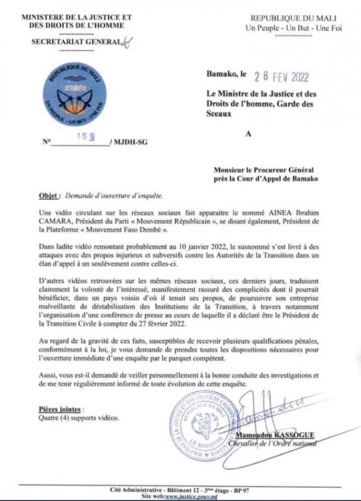 Kassogué souligne que « des vidéos retrouvées sur les réseaux sociaux, ces derniers temps, traduisent clairement la volonté de l’intéressé, manifestement rassuré des complicités dont il pourrait bénéficier, dans un pays voisin d’où il tenait ses propos, de poursuivre son entreprise malveillante de déstabilisation des institutions de la transition, à travers notamment l’organisation d’une conférence de presse au cours de laquelle, il a déclaré être président de la transition civile à compter du 27 février 2022  ».