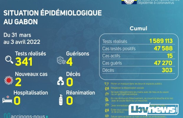 Le Gabon enregistré 02 nouveaux cas positifs sur 341 tests réalisés, soit un taux de positivité de 0.6%, 00 personne hospitalisée dont 00 en réanimation, 04 nouvelles guérisons et 00 nouveau décès.