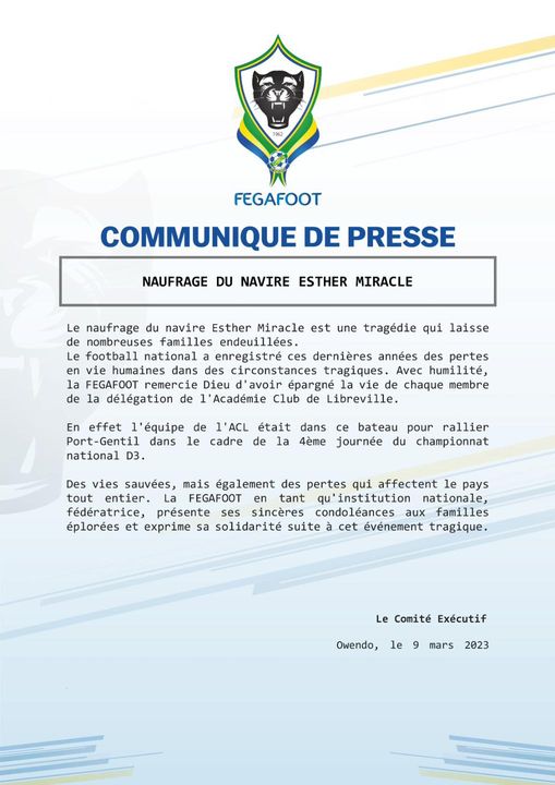 Dans la nuit du 8 au 9 mars, le Gabon a enregistré une tragédie avec le naufrage du bateau Esther Miracle qui avait à son bord près de 150 personnes dont 22 membres de l’Académie Club de Libreville.