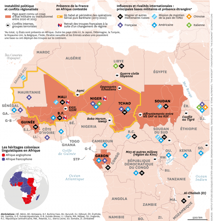 Et la propagande de Moscou, qui place ses pions dans la région avec la milice Wagner, vient cristalliser ce ressentiment. Mais les Français se voient aussi reprocher des dysfonctionnements dont ils ne sont pas responsables, les vieux intérêts politiques de Paris – la célèbre “Françafrique*” – servant alors d’alibi pour justifier tous les malheurs qui frappent le continent.