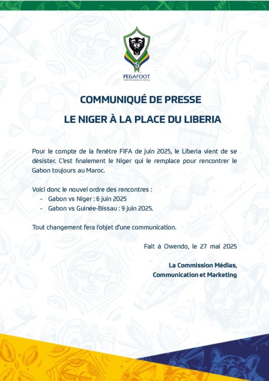 À quelques jours de la trêve internationale, un imprévu est venu bousculer les plans de la sélection gabonaise. Initialement programmé pour affronter le Libéria le 6 juin prochain, le Gabon devra finalement se mesurer au Mena du Niger, selon un communiqué officiel publié ce mardi par la FEGAFOOT.